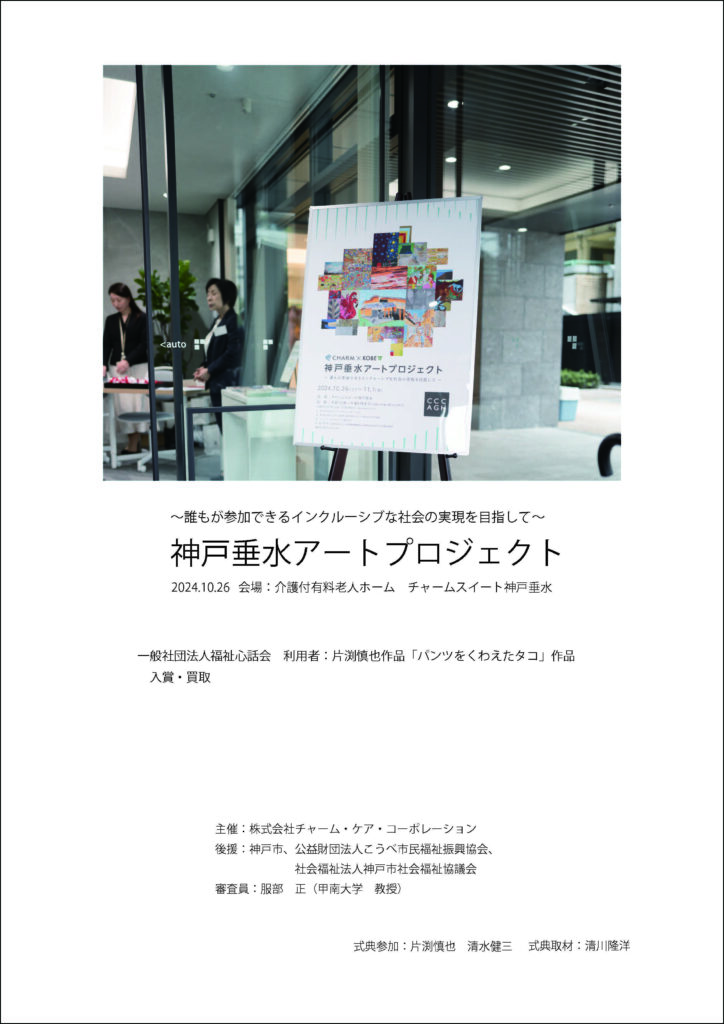 障がいのあるアーティストが、社会に羽ばたくことを目的とした連携協定にもとづき「神戸垂水アートプロジェクト」が実施されました。本プロジェクトの入選作品 19 点のうちの 1 点に片渕慎也さんの作品名「パンツをくわえたタコ」が選ばれ、株式会社チャーム・ケア・コーポレションへ譲り受けられました。去る、2024 年 10 月 29 日に介護付有料老人ホームにて表彰式がありました。