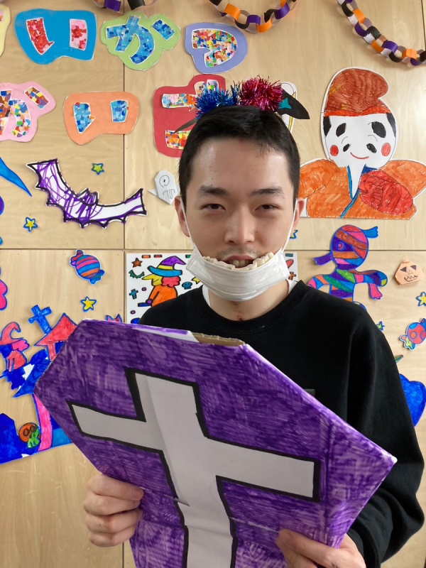 ハロウィンの壁面飾りの前で記念撮影!