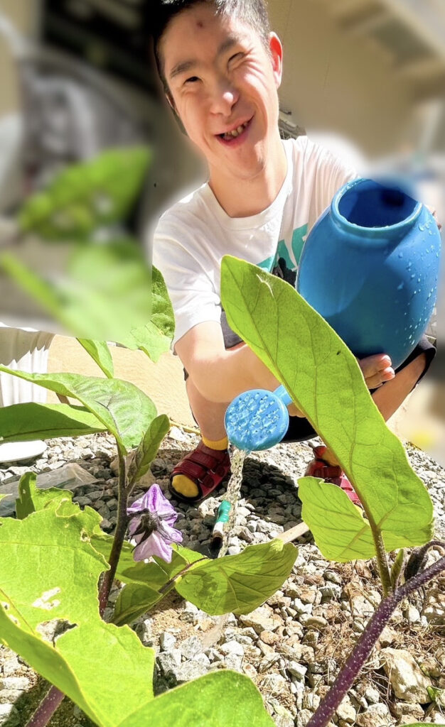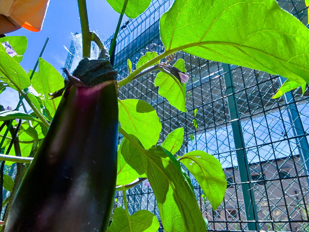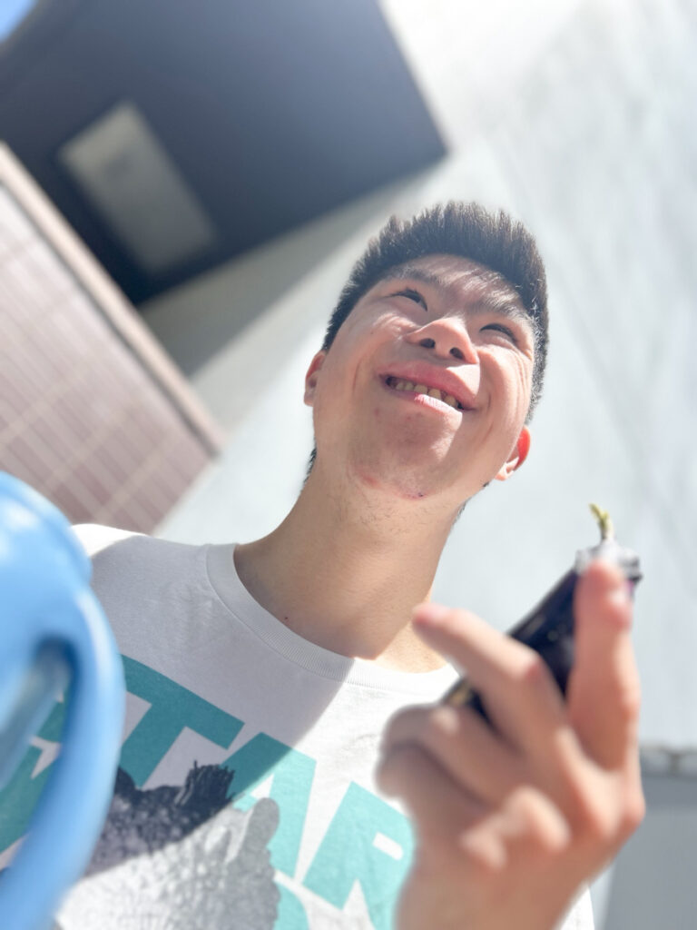 出屋敷ホームでは今年はナスが元気に育ちました? 園芸スペースにはトマトやピーマン、赤じそも育てており、利用者さんが毎日水やりをして大切に育てています。これからの収穫を皆さんとても心待ちにされています!