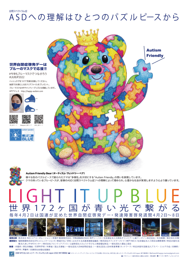 毎年4月2日は国連が決めた世界自閉症啓発デーになります。 世界172ケ国が青い光で繋がる。今年は、オーティズム・フレンドリー・ベアが登場してASD自閉スペクトラム症への理解をPRします。 今年も、兵庫県、神戸市、芦屋市版のポスターを一般社団法人福祉心話会がデザインしました。 4月2日から8日まで、発達障害啓発期間です。 より多くの方々が自閉症の啓蒙と理解にご協力いただきますようにお願い申しあげます。