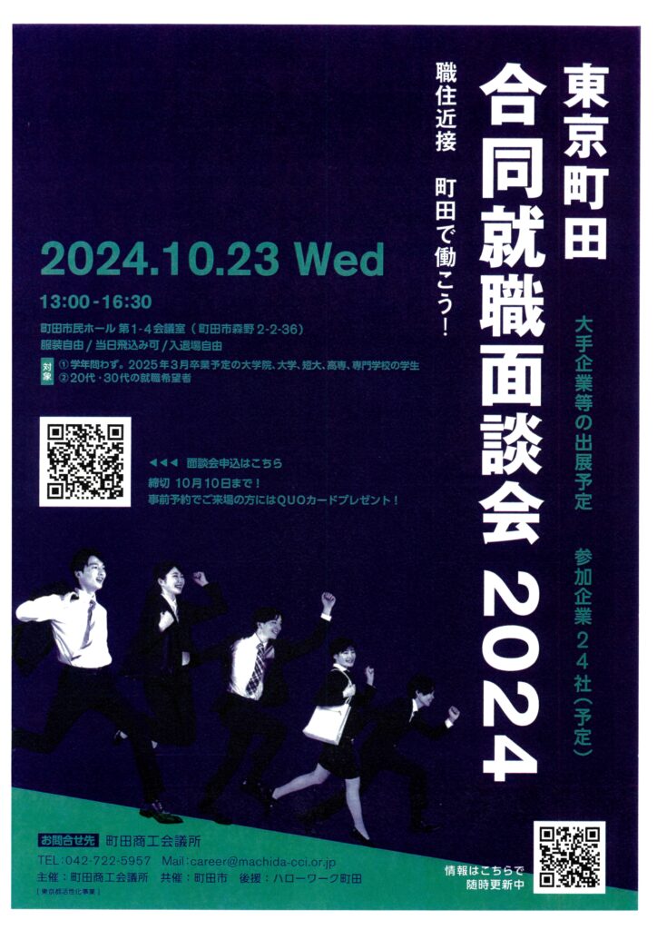 10月23日(水)、町田市民ホールで行われる「東京町田合同就職面談会2024」に出展します。