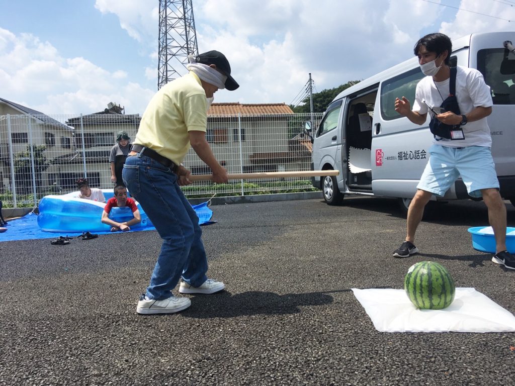 今年の夏は、皆さんいかがお過ごしでしょうか? しんわ常盤事業所・常盤支所の皆さんは、コロナ禍のため遠くまで出かけることができませんでしたが、 駐車場内で夏イベントを行いました。 この日はテントを設営し隣に涼しい水をたっぷり入れたビニールプールを用意しました。 イベントが始まったら皆さんプールに飛び込んで大きな水しぶきをあげ楽しく遊ばれました。 普段体をあまり動かさない方もプールの中に入って涼しい時間を楽しまれ、ずっと笑い声が駐車場で響き渡っていました。