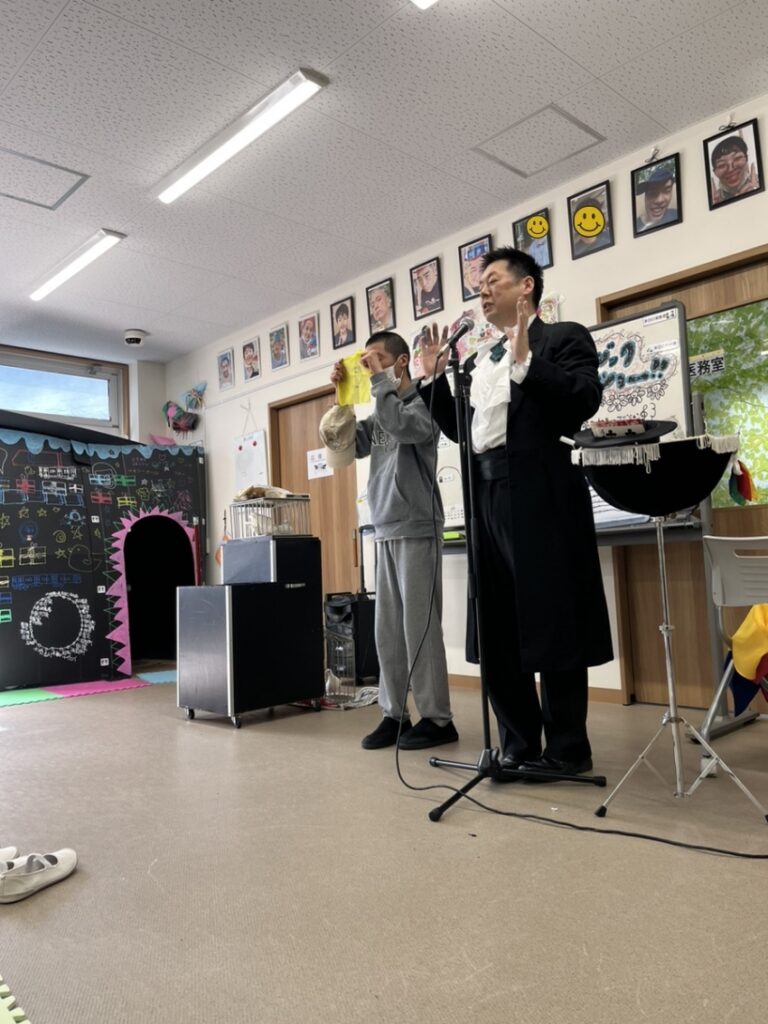 ショーの最後には2名のご利用者様が助手としてステージに登場。初めての経験に最初は緊張された面持ちでしたが、最後まで頑張ってお手伝いしていただけました。
