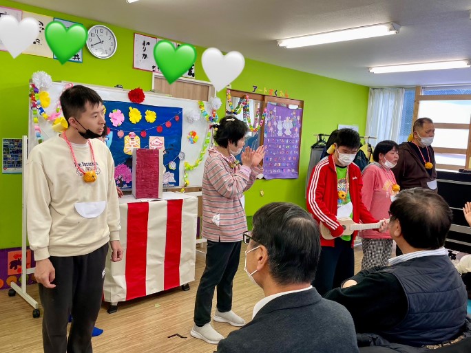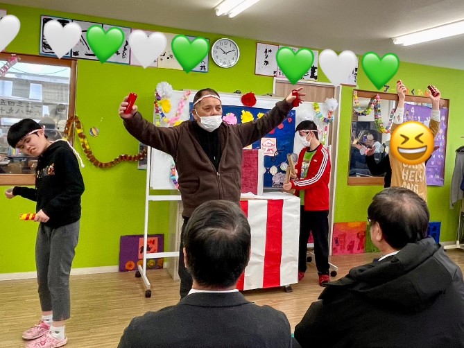 今年は初めて演劇にも挑戦しました。ダンスや歌の練習に加えて、演劇練習ではセリフを覚えることや小道具作りなども大変でしたが、何度も練習し、本番は大成功でした!また合同発表会ということで3つの事業所が集まっての練習は大変でしたが、ご利用者の皆様・スタッフで協力し、大盛り上がりの発表会となりました。