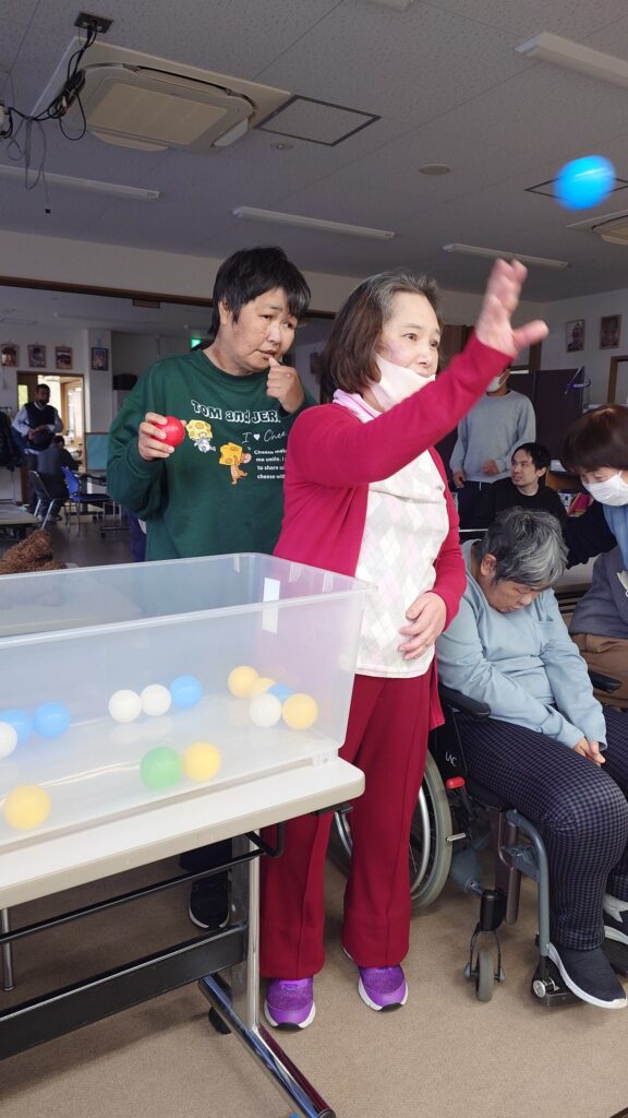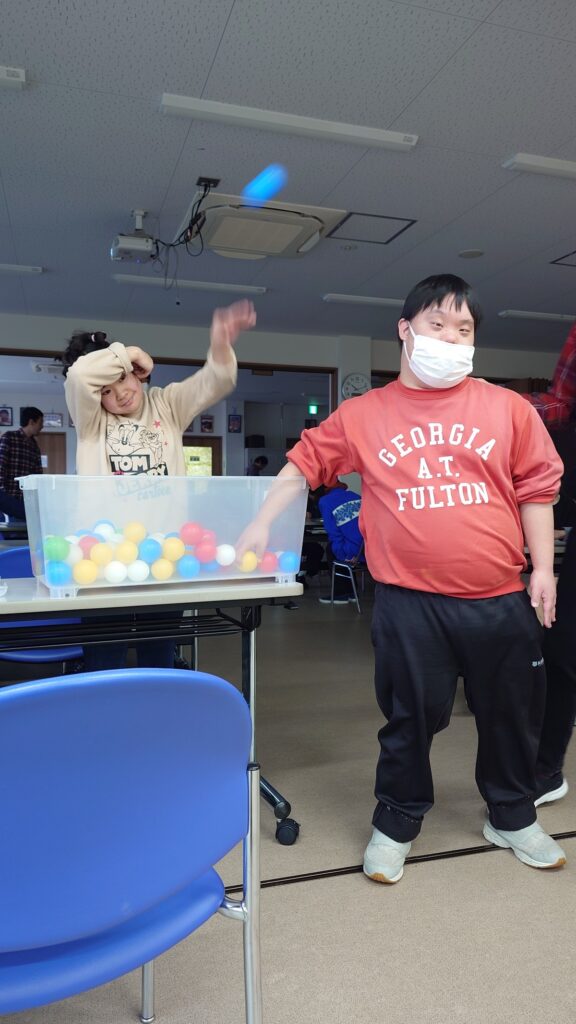 立候補された利用者様が手作りの鬼のお面をかぶって鬼の役に。他の利用者様たちが元気に「福は内!」「鬼は外!」と声を出しながらボールを投げました。鬼役の利用者様も笑顔で逃げて楽しそう。