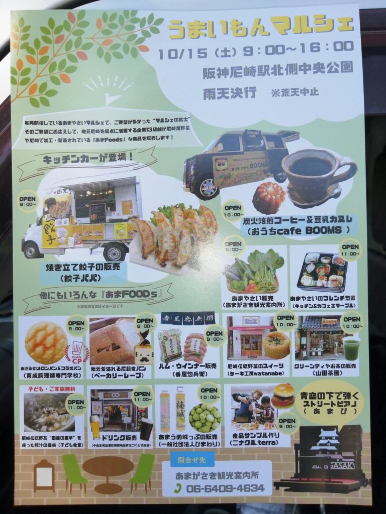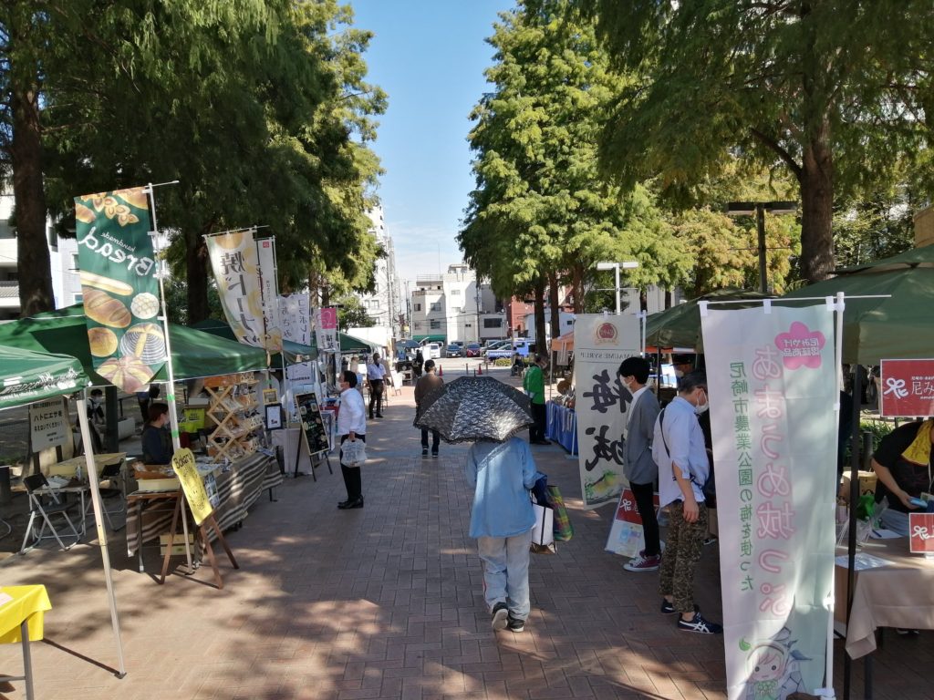 本日は、阪神尼崎駅北にある尼崎中央公園で開催中の「うまいもんマルシェ」に出店しています。いつもはあまがさき観光案内所内で販売していますが、今回はマルシェの拡大ということで、地元尼崎を拠点に活躍する企業が13店舗揃いました! 尼崎産野菜や尼崎で加工・製造されている「あまFoods」な商品を販売しています。