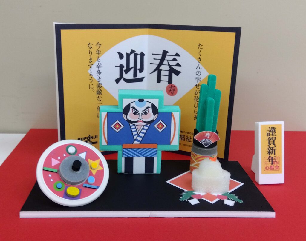 利用者の就労での作業で廃棄されるスポンジ素材を再利用し、お正月飾りをエコ商品として製作しました。年末、年始にかけてお家の玄関に飾っていただき、その年の幸多かれと祈願を込めてセットいただく商品として開発しました。来年はギフト商品として開発予定です。