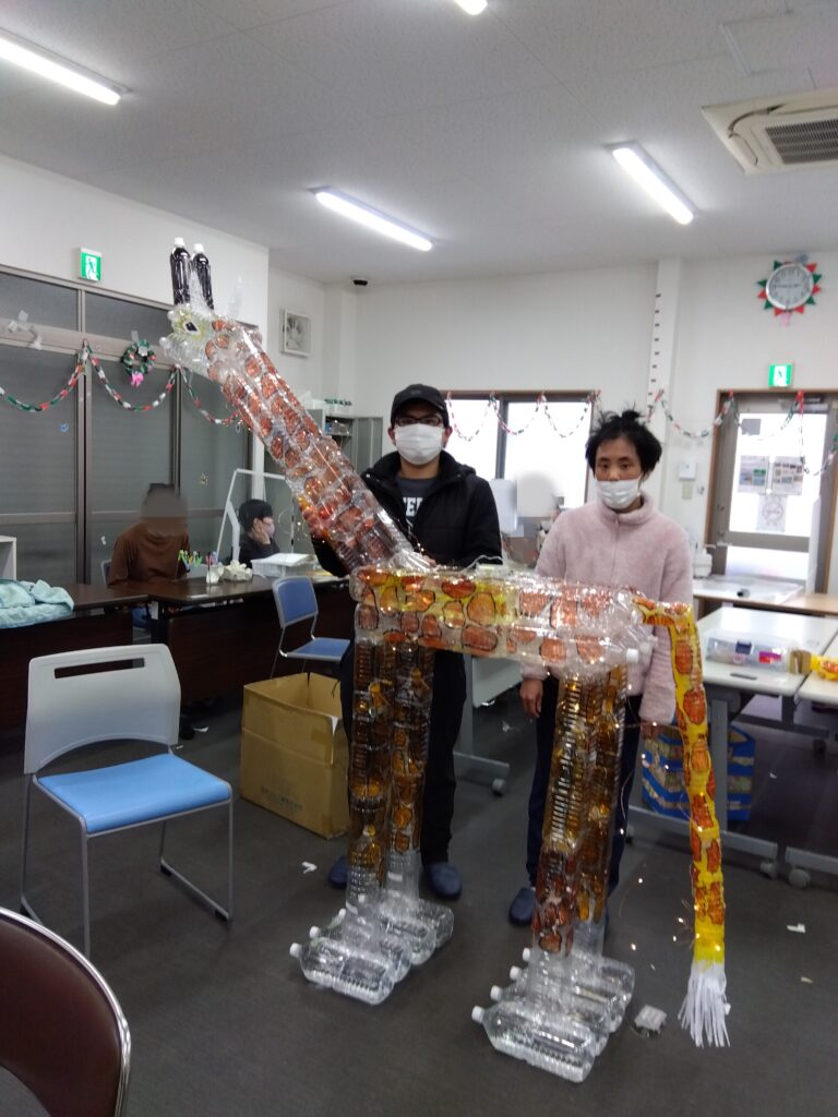 ペットボトルを廃棄しないで集めてクリスマスに光のイルミネーションを重ねてキリンのペットボトルモニュメントを制作しました。