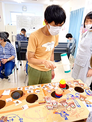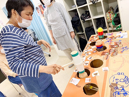 皆さんが紙コップで作ったモグラを手に持って、スタッフと一緒に楽しくゲームの時間を過ごされました!