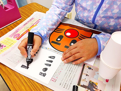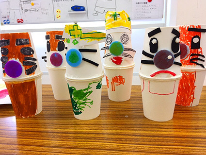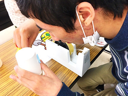 作り方はとても簡単で、2つのコップのふちとふちの部分をセロハンテープでくっつけて、その上に色ペンで自由に絵を描いたり、好きな素材で貼り付けたりしたらモグラの完成ですモグラたたきゲームはできるのではないかと気づいた利用者さんは段ボールでゲームの道具を作り始めました。