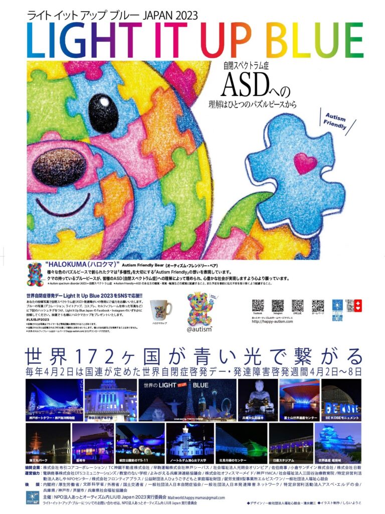 「自閉スペクトラム(ASD)への理解はひとつのパズルピースから」をテーマに、HALOKUMA(ハロクマ)をメインにB2ポスター、A4チラシ表裏をデザインしました。