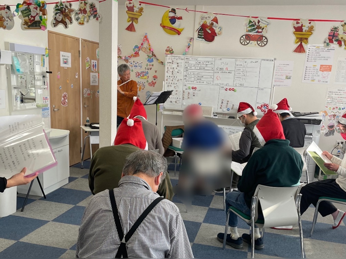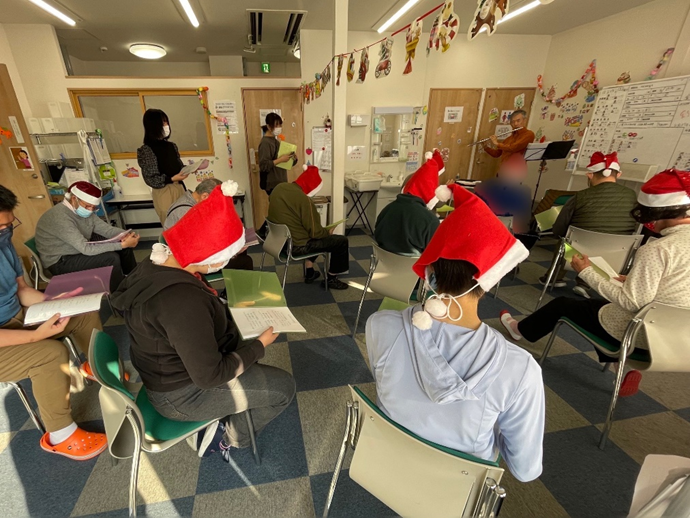ご利用者様も前日から楽しみにされていて、朝からサンタ帽を被って準備万端でした。