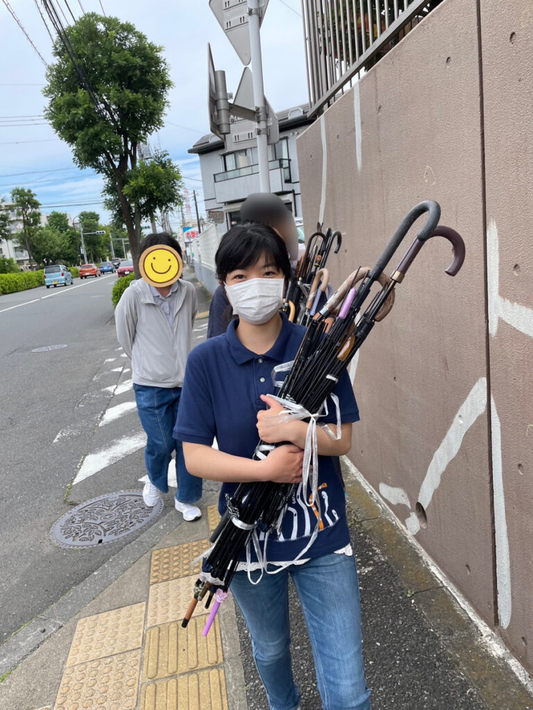 事業所近くの木曽クリーンセンターリサイクル広場から傘を受け取り、解体の作業を行っています。 布部分はエコバッグ製作に使用し、骨はクリーンセンターに分別してお返ししています。 6月にはご利用者様と職員で歩いて傘の骨を運びました。ご利用者様は「傘の骨持ってきましたー!」と元気よくセンターの方に挨拶をしていました!