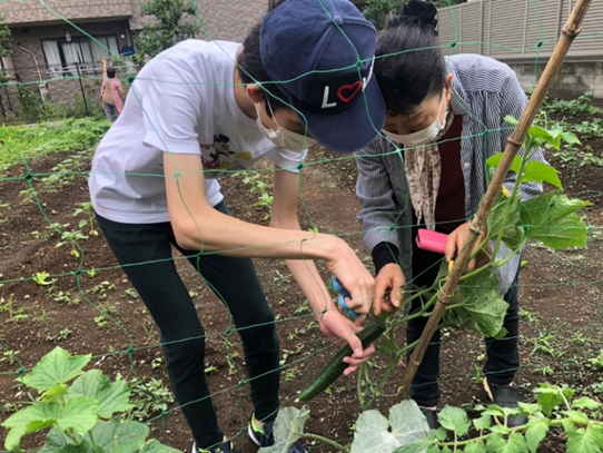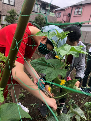 みんなで夏野菜の収穫を行いました。そして収穫のやり方を教わり大きなキュウリも採れました。