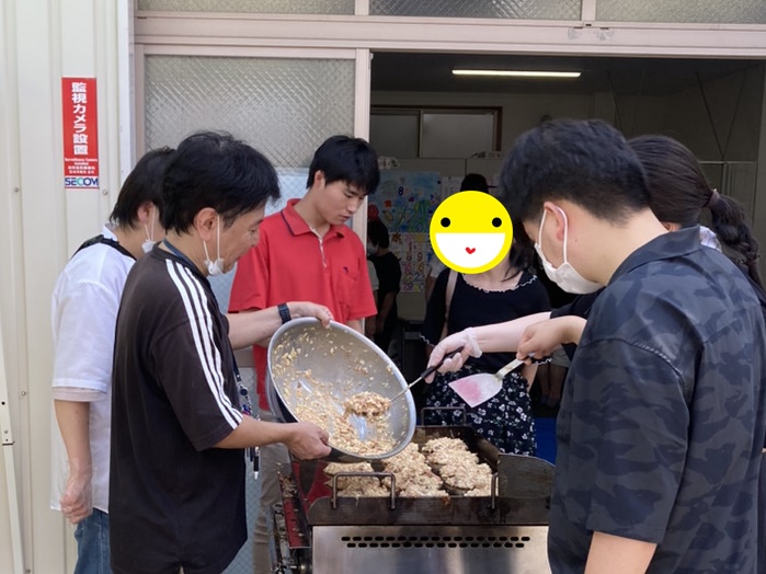 各日約60人の参加で調理準備も大忙し。みんなで協力して作ったお好み焼きに焼きそば「美味しい!!」と大好評。
